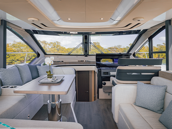 The all-new 57 FLY offers the most accommodations for entertaining, superior water interaction, and a fresh, modern interior. The main deck impresses with a state-of-the-art helm, versatile seating, and a fully equipped galley seamlessly connected to an inviting veranda, perfect for socializing.